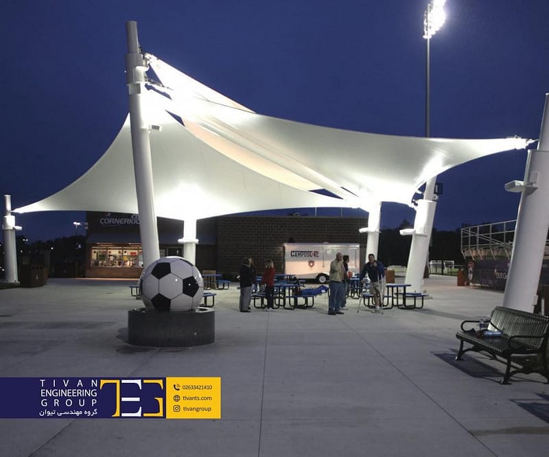 به عنوان یک بخش مهم از طراحی سازه پارچهای کششی، باید در خصوص نورپردازی سقف مدرن آن به خوبی فکر شود. نورپردازی این سازهها میتواند در محیط داخلی و یا خارجی آنها انجام شود؛ مثلا برای نورپردازی داخلی استفاده از نور جلو برای ایجاد نور منعکسشده نرم برای سقفها یا صفحهها گزینه مناسبی است و همچنین برای سایبانهای خارجی، نورپردازی به سمت بالا میتواند نور را به سطح برگرداند.