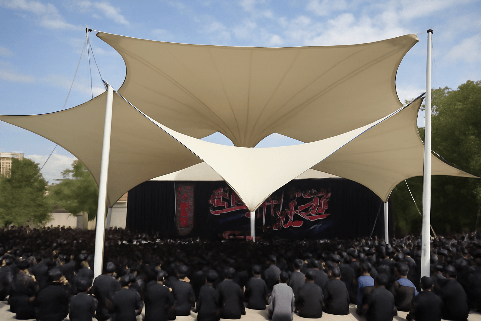 - سازههای کششی وسیع، گزینهای هوشمندانه برای ایجاد فضاسازی محیطی در مراسمهای پرجمعیت مانند سخنرانیها، تجمعات مذهبی یا فرهنگی هستند؛ چراکه علاوهبر پوششدهی مناسب به نظم و امنیت فضا نیز کمک میکنند.